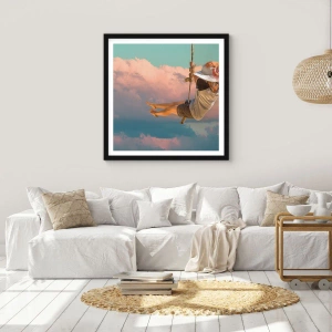 - Este pôster retrata uma mulher em um balanço em meio a nuvens em tons pastéis. Perfeito para interiores modernos, vem com moldura preta.