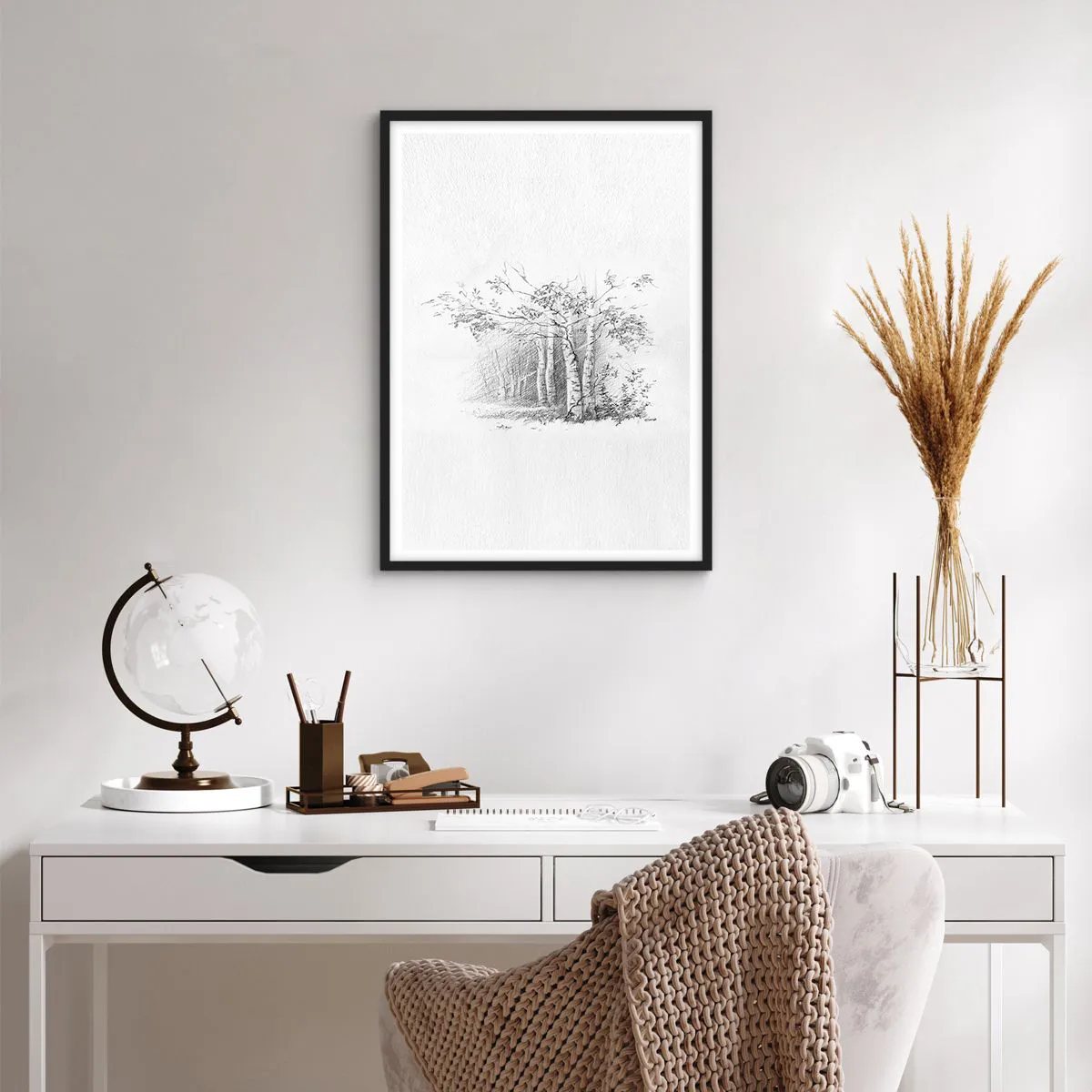 - O pôster apresenta um sutil esboço em preto e branco de uma floresta de bétulas. Essa delicada composição traz harmonia e tranquilidade a qualquer ambiente.