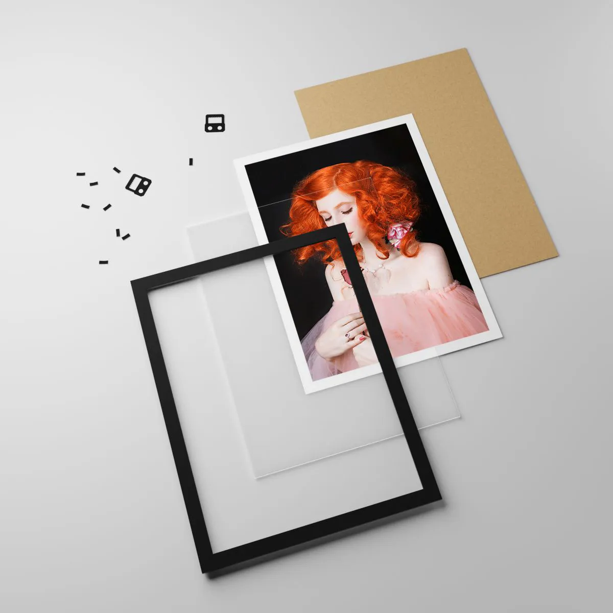 No Estilo Barroco é um pôster elegante que retrata o retrato de uma mulher ruiva segurando uma rosa em um fundo preto profundo. O contraste entre a claridade de sua pele, a intensidade de seus cabelos ruivos e o fundo preto cria uma composição incrivelmente expressiva que atrai a atenção e exala um caráter artístico. Detalhes sutis, como a delicadeza da rosa e a leveza do vestido rosa, adicionam romance e classe à imagem.