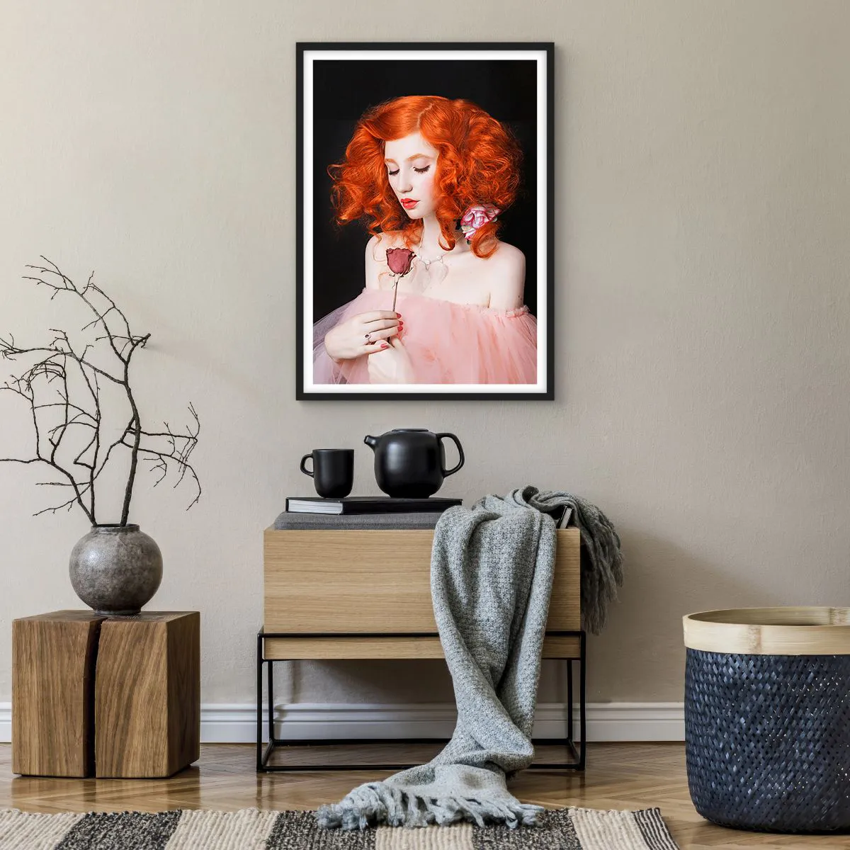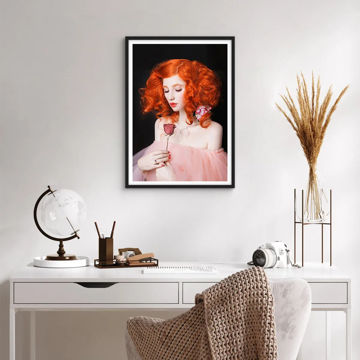 - Este pôster retrata o retrato de uma mulher ruiva segurando uma rosa sobre um fundo preto. Perfeito para decorar um interior artístico e romântico.