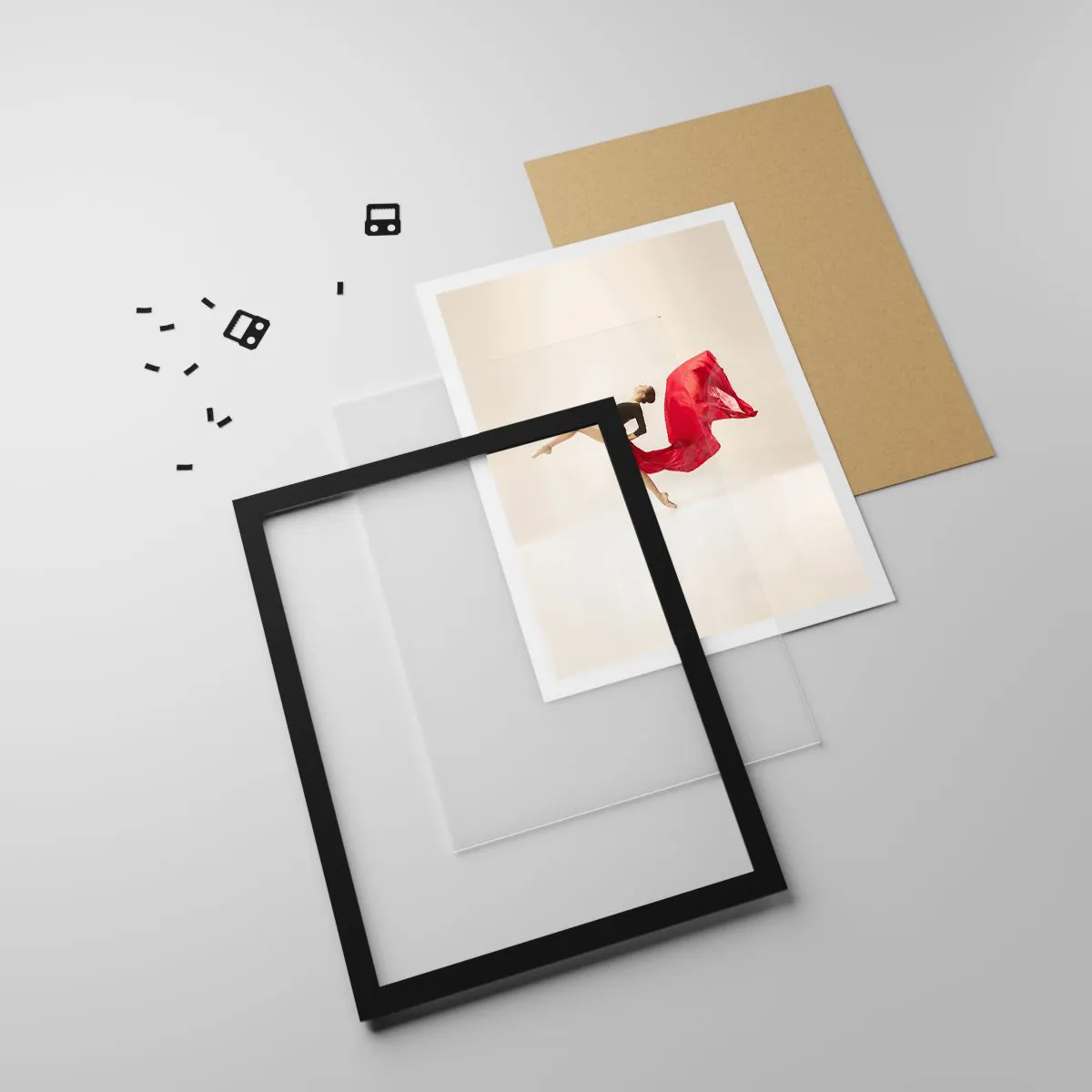 - Este pôster retrata uma dançarina em traje preto e movimentos dinâmicos, emoldurada por tecido vermelho. Uma adição elegante a interiores modernos. O pôster mede 50x70 cm e possui moldura preta.