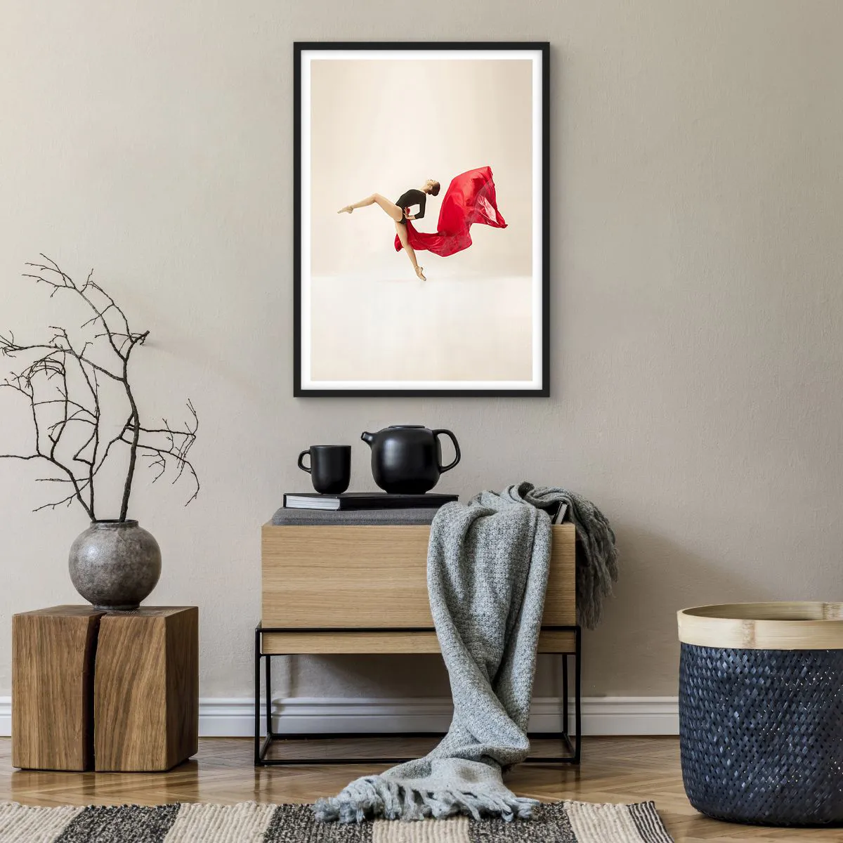 A dançarina em movimento simboliza liberdade e paixão, e o vermelho intenso do tecido adiciona drama e energia. O fundo minimalista permite que você se concentre no tema principal, tornando este pôster a escolha ideal para os amantes da arte e da harmonia em design de interiores.
