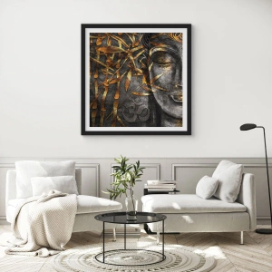 - Com um retrato de Buda em tons de dourado e cinza com folhas de bambu, este pôster exala paz e harmonia. Perfeito para interiores de inspiração zen. Inclui moldura preta. Tamanho: 50 x 70 cm.
