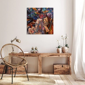 As cores da pintura são baseadas em tons intensos de azul, vermelho, amarelo e verde, que se entrelaçam harmoniosamente, criando uma composição expressiva e vívida. Detalhes como o arco do contrabaixo, as teclas do piano e as silhuetas dos músicos enfatizam o caráter artístico da obra, tornando-a uma adição única a qualquer interior.
