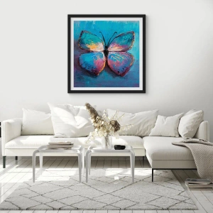 - Este pôster retrata uma linda borboleta em vibrantes cores do arco-íris sobre um fundo de tons azuis. A imagem ostenta um estilo moderno e textura expressiva, adicionando elegância a qualquer interior.