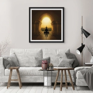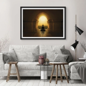 Pôster com moldura preta - Uma figura meditando no arco de um templo tendo como pano de fundo o sol nascente - 50x70cm - Harmonia completa - Decoração de parede moderna para a sala de estar e quarto ARTTOR
