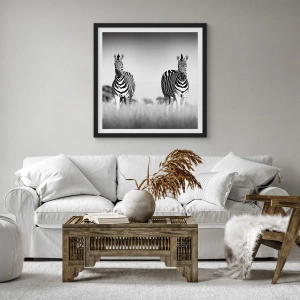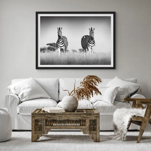 - O pôster retrata uma zebra em pé na savana, em preto e branco. A composição expressiva exala elegância e minimalismo, complementando perfeitamente interiores modernos.