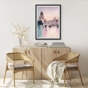 Pôster com moldura preta - Cena da cidade com silhuetas de pessoas e luzes na névoa da chuva - 50x70cm - Na névoa chuvosa - Decoração de parede moderna para a sala de estar e quarto ARTTOR