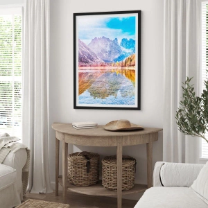 Pôster com moldura preta - Paisagem montanhosa com um lago e cores de outono - 50x70cm - E nas montanhas é outono - Decoração de parede moderna para a sala de estar e quarto ARTTOR