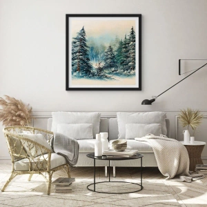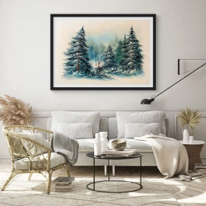 - Árvores cobertas de neve em uma floresta de inverno com um céu tranquilo. O pôster perfeito para evocar a atmosfera mágica do inverno e das festas de fim de ano.