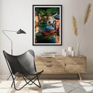 Pôster com moldura preta - Um canal de água com barcos cercados por edifícios tradicionais à noite - 50x70cm - Uma noite em uma rua chinesa - Decoração de parede moderna para a sala de estar e quarto ARTTOR