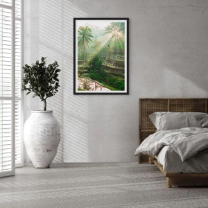 - Este pôster de paisagem tropical retrata terraços de arroz cercados por palmeiras e raios de sol. Perfeito para interiores que capturam a tranquilidade e a beleza da natureza.
