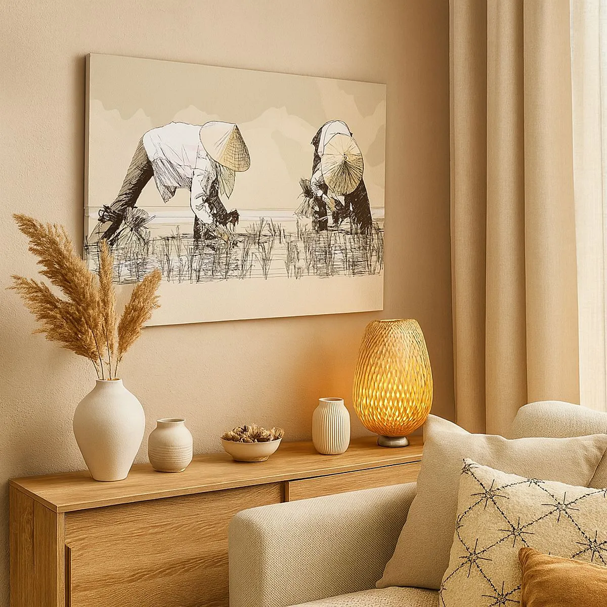 A pintura "Colheita Bem-Sucedida" retrata uma cena pacífica da vida de agricultores trabalhando em um campo de arroz. As figuras retratadas, vestidas com chapéus cônicos tradicionais, prestam homenagem ao cotidiano rural e ao trabalho árduo, que se encaixam na paisagem tradicional do interior da Ásia.