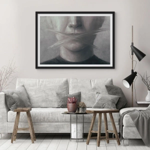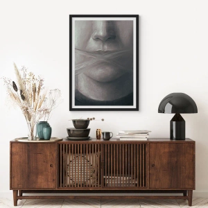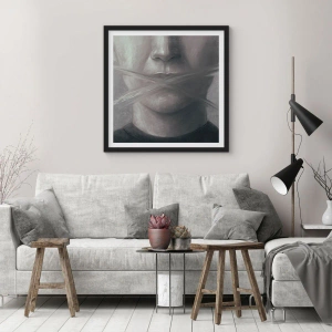 Pôster com moldura preta - Um rosto simbólico com a boca coberta em cores monocromáticas. - 50x70cm - Nem uma palavra - Decoração de parede moderna para a sala de estar e quarto ARTTOR