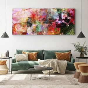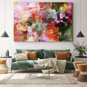 O ponto focal da pintura é a harmonia das cores que se combinam perfeitamente em uma forma abstrata. Tons vívidos de rosa e vermelho são complementados por tons mais suaves de verde, branco e bege, conferindo profundidade e riqueza à obra. Pinceladas artísticas e detalhes estruturais enfatizam a expressividade e a natureza emocional da composição.