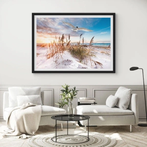 - Este pôster retrata um pássaro voando sobre um litoral pitoresco com dunas e mar ao pôr do sol. É a decoração perfeita para um interior em estilo natural.