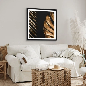 - Este elegante pôster com folhas douradas sobre fundo preto é perfeito para interiores elegantes. Ele complementa perfeitamente designs modernos e minimalistas. O conjunto inclui uma moldura preta de 50x70 cm.