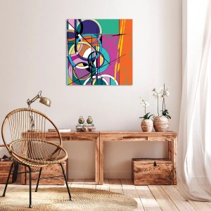A arte em tela "Abstração colorida com círculos geométricos" é uma composição dinâmica e inspiradora que atrai a atenção com suas cores vibrantes e formas geométricas. O motivo central são círculos e linhas que se cruzam, criando uma estrutura harmoniosa repleta de energia e criatividade. Cores vibrantes combinadas com formas abstratas conferem à imagem um caráter moderno e expressivo.