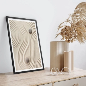 - O pôster apresenta uma composição minimalista inspirada em um jardim zen japonês, onde linhas harmoniosas na areia circundam as pedras. A estética sutil traz paz e equilíbrio ao interior.