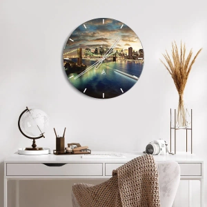 - Este relógio de parede redondo apresenta uma imagem do horizonte de Nova York ao entardecer, com a Ponte do Brooklyn e as luzes da cidade. Perfeito para interiores modernos, é feito de vidro e mede 30x30 cm.