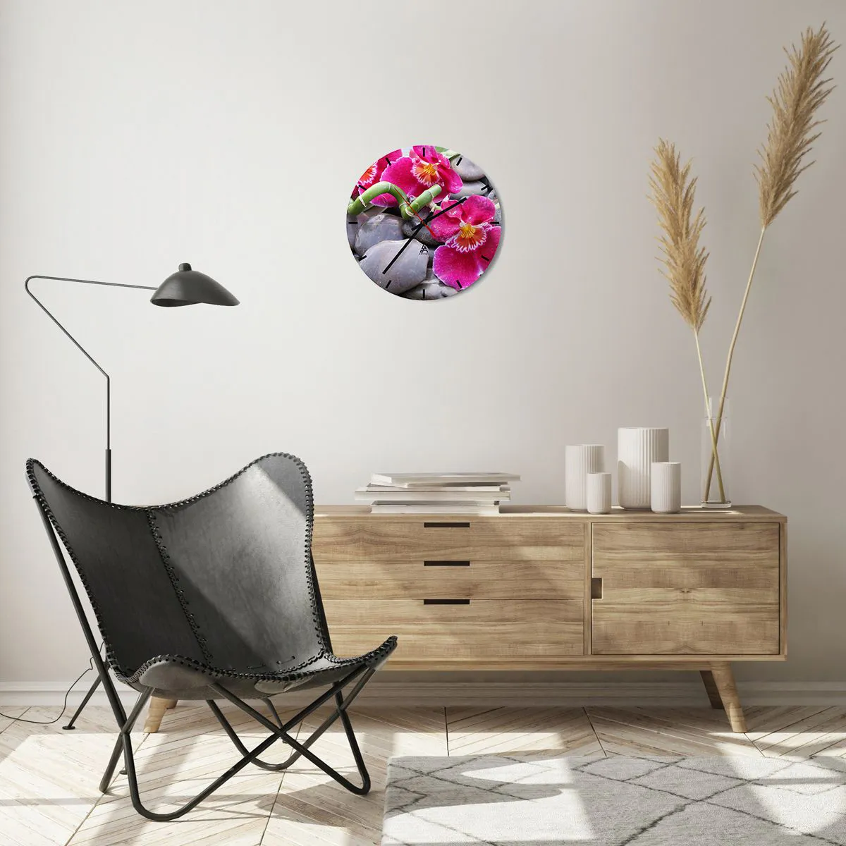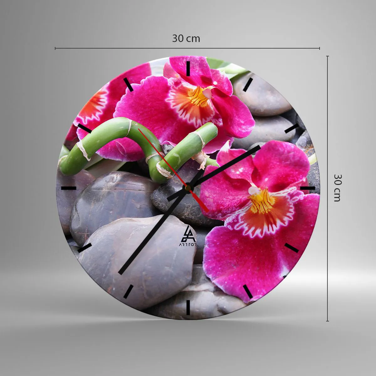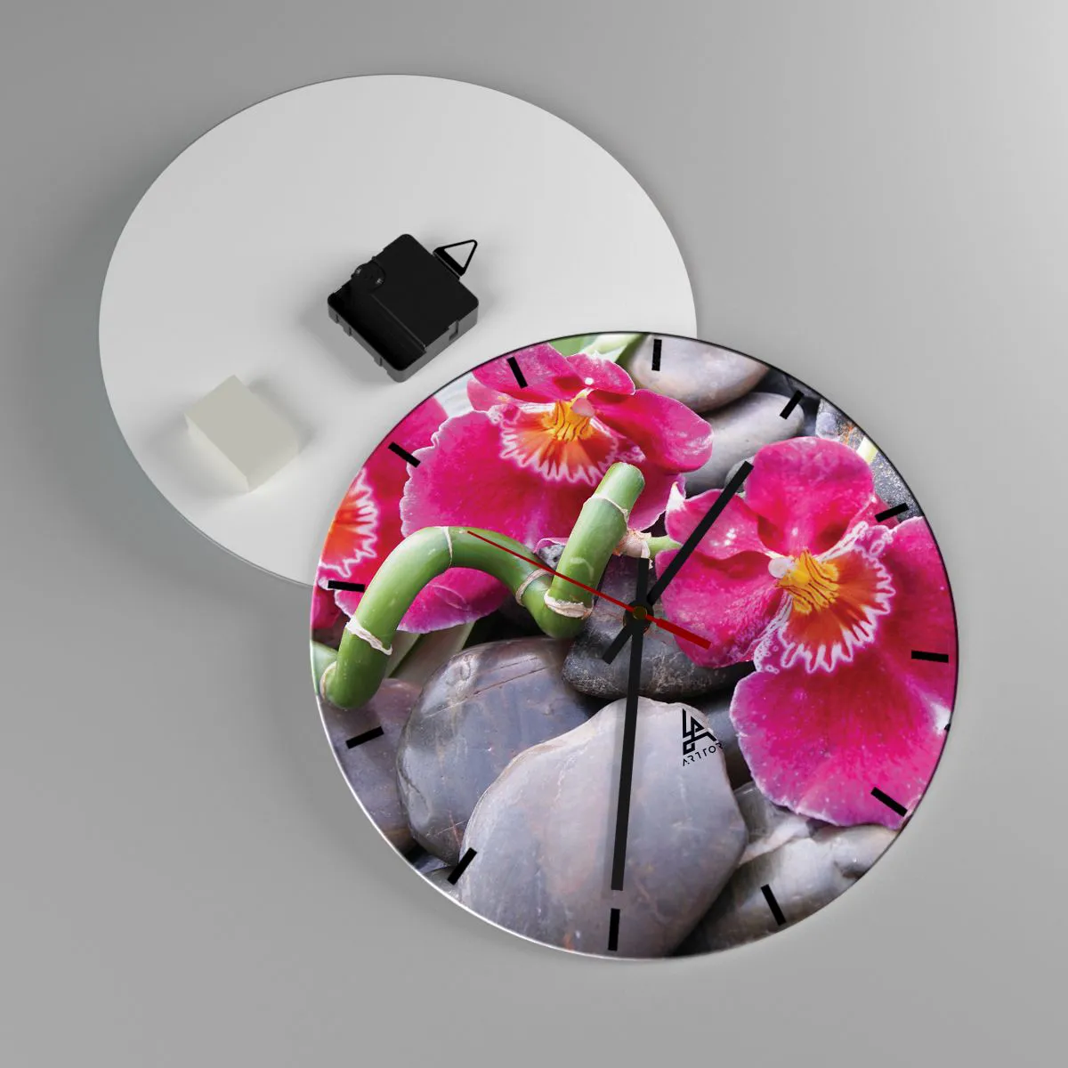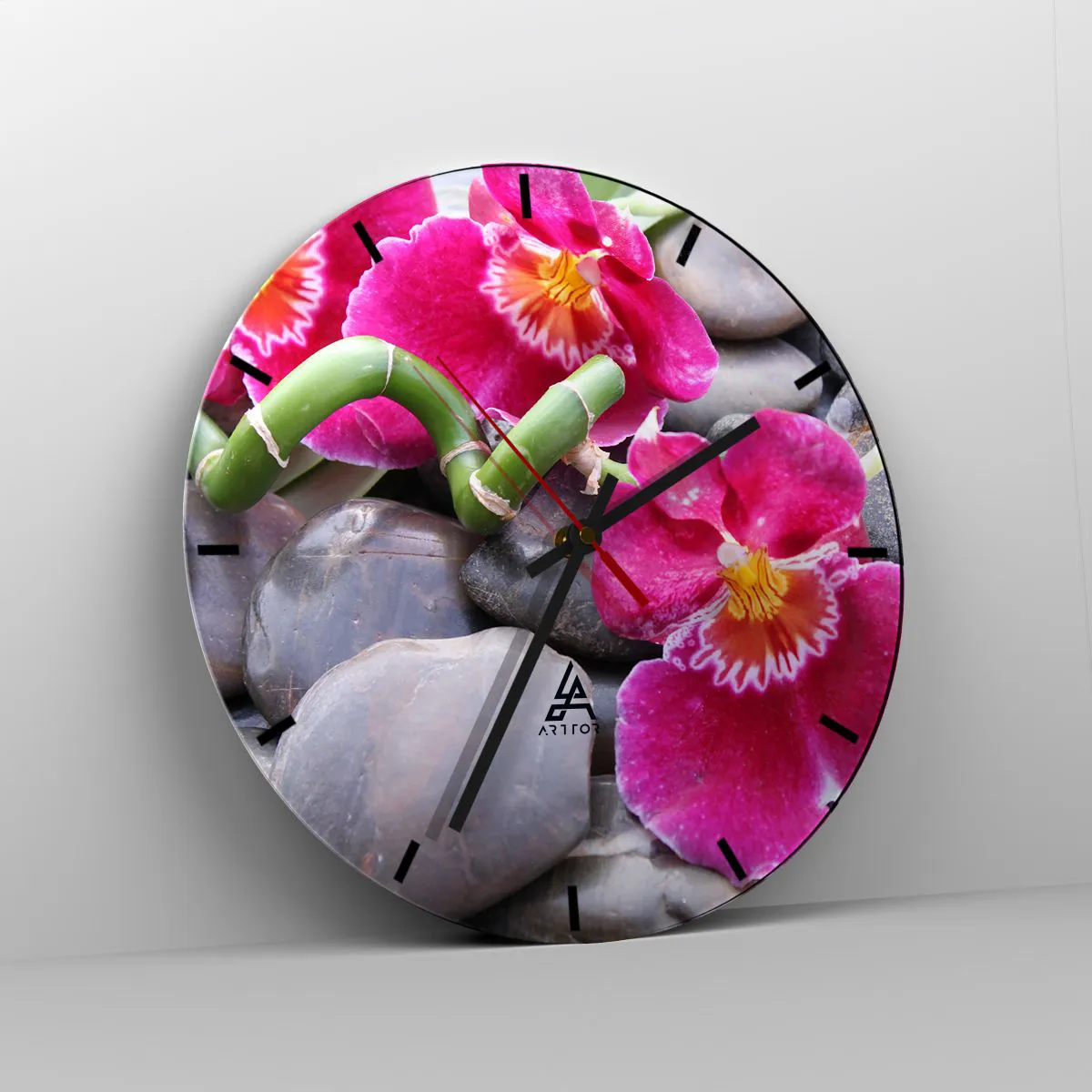 - Orquídeas cor-de-rosa sobre um fundo de pedras e bambu verde criam um tema tranquilo e harmonioso. Este relógio de parede é perfeito para interiores inspirados na natureza e no relaxamento.