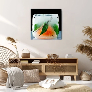 Relógio de parede - Relógio em vidro - Um cubo de gelo com folhas de hortelã e uma fatia de toranja dentro - 30x30cm - Frescor e refresco - Decoração de parede moderna para a sala de estar, cozinha e quarto ARTTOR
