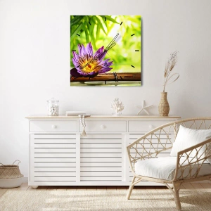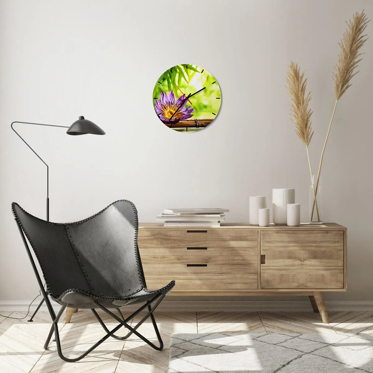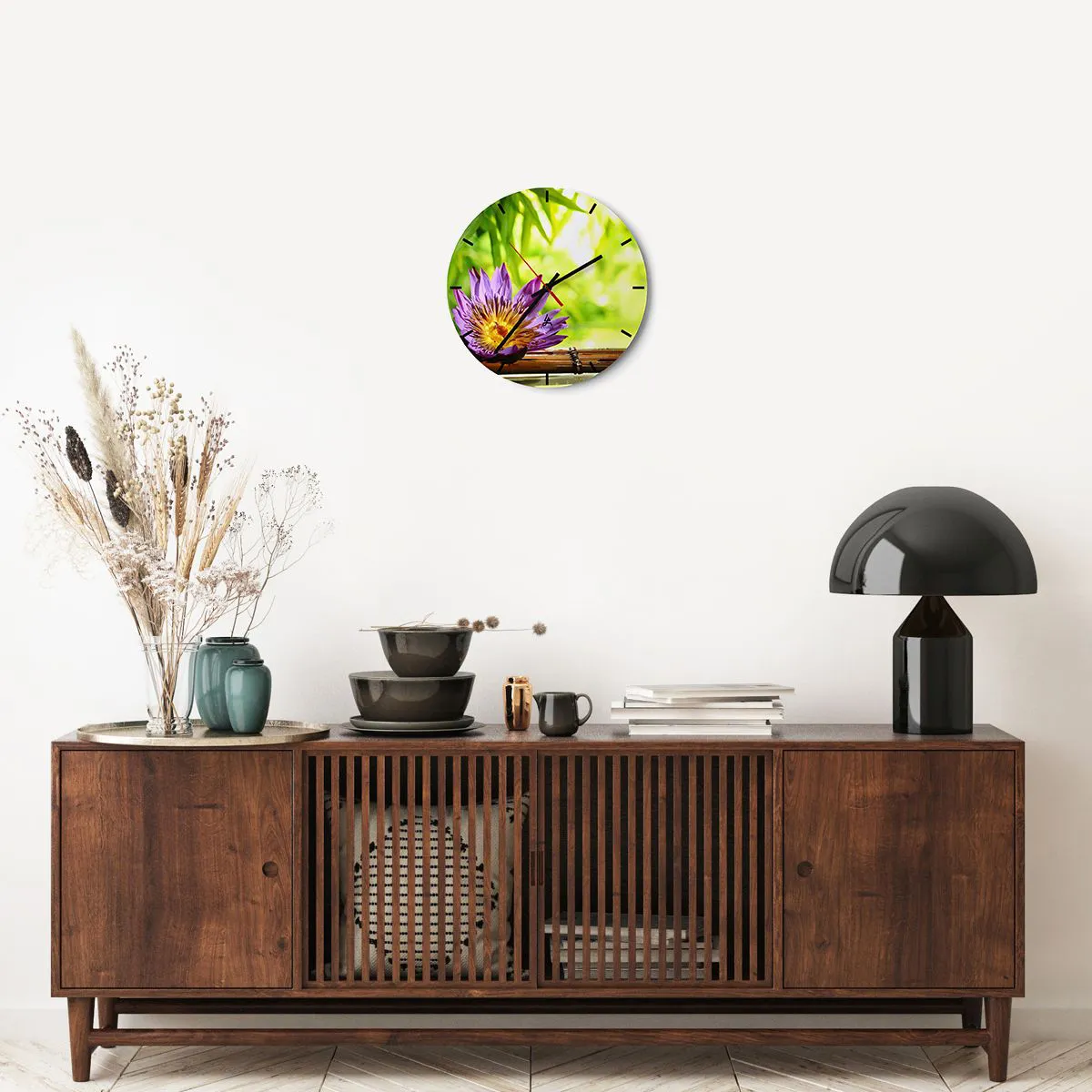 - Este relógio de parede apresenta um motivo de lótus roxo sobre um fundo de bambu e vegetação verde. É o elemento decorativo perfeito para interiores inspirados pela harmonia e uma atmosfera zen.
