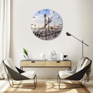 O relógio é feito de vidro de 4mm de espessura. A tecnologia de relógio está em conformidade com a classe de segurança 2B2 de acordo com a norma PN-EN 12600:2004, o que garante resistência ao impacto. O relógio em vidro está pronto para ser pendurado – possui um gancho de metal montado na parte de trás do relógio e um espaçador de espuma, que regula a distância uniforme entre o relógio e a parede. O relógio tem um mecanismo de fluxo silencioso alimentado por uma bateria de 1,5 V - bateria AA (a bateria não está incluída).