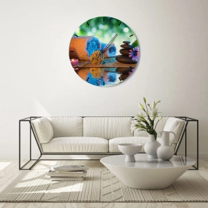 "{title_spa}" é um relógio de parede exclusivo que nos transporta para uma atmosfera de relaxamento e harmonia. O motivo retrata uma composição de spa com pedras, uma toalha e uma vela em um cenário pitoresco de natureza. Este padrão artístico traz paz e estética ao interior, complementando perfeitamente espaços de inspiração zen.