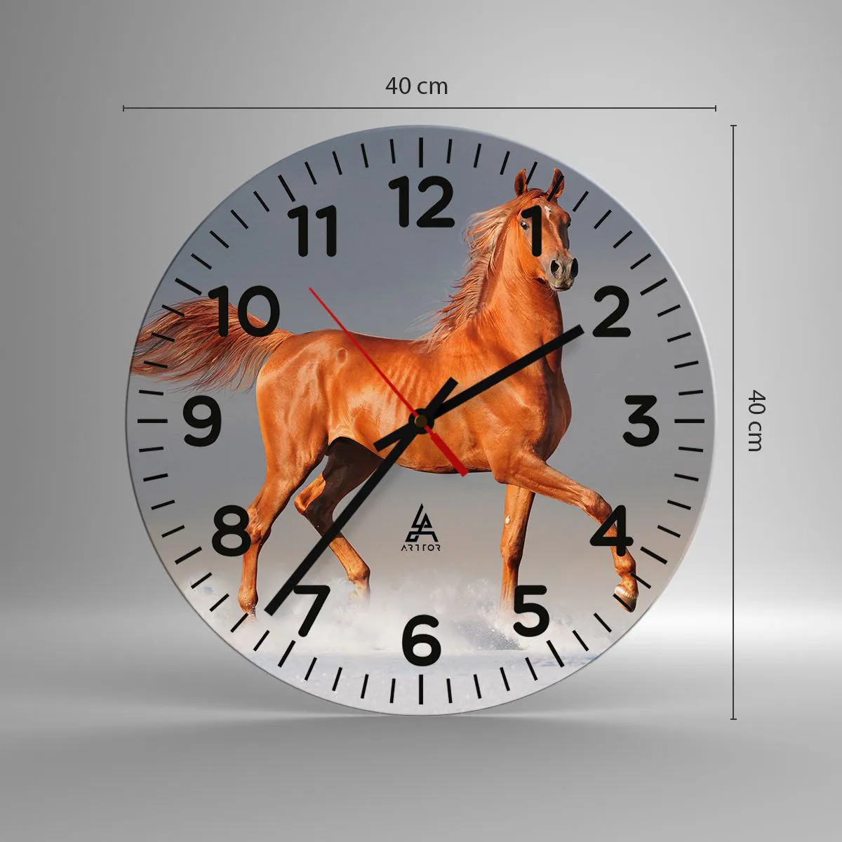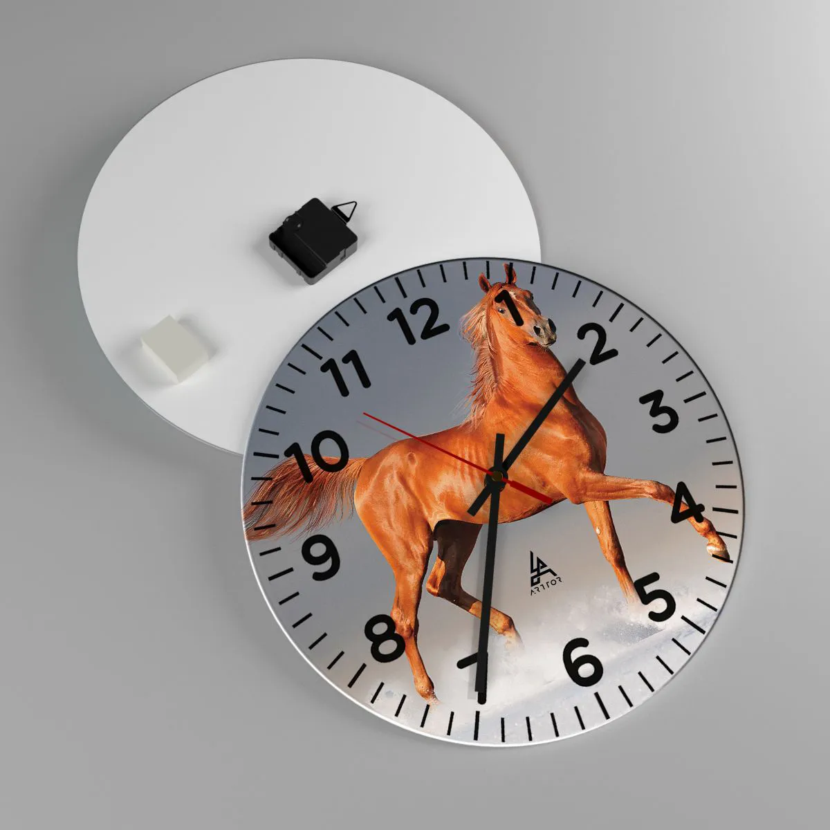 O relógio é feito de vidro de 4mm de espessura. A tecnologia de relógio está em conformidade com a classe de segurança 2B2 de acordo com a norma PN-EN 12600:2004, o que garante resistência ao impacto. O relógio em vidro está pronto para ser pendurado – possui um gancho de metal montado na parte de trás do relógio e um espaçador de espuma, que regula a distância uniforme entre o relógio e a parede. O relógio tem um mecanismo de fluxo silencioso alimentado por uma bateria de 1,5 V - bateria AA (a bateria não está incluída).