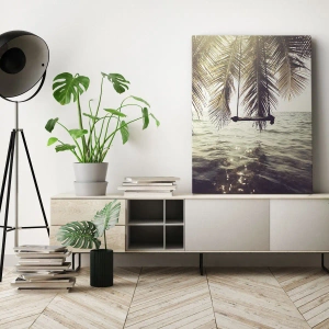 A pintura em tela "Palmeira com balanço sobre a água sob a luz do sol" é uma decoração que traz harmonia e uma atmosfera de relaxamento tropical ao interior. A composição retrata uma palmeira com um balanço suspenso sobre águas calmas, iluminada pela luz suave do sol.