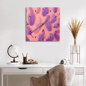 Relógio de parede - Relógio em vidro - Penas roxas em um fundo rosa - 30x30cm - Ave lilás do desejo - Decoração de parede moderna para a sala de estar, cozinha e quarto ARTTOR