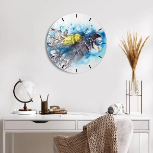 - Um relógio de parede com um mergulhador e peixes coloridos em um mundo subaquático artístico. O complemento perfeito para qualquer interior, trazendo um toque exótico e relaxante.