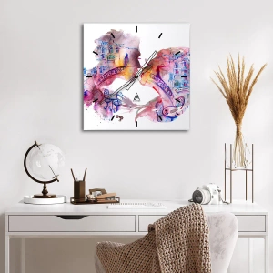 As cores dominantes do relógio são rosa, roxo e azul, que criam uma composição harmoniosa e expressiva. Cada elemento do gráfico foi cuidadosamente projetado para atrair o olhar e inspirar reflexão. Detalhes ornamentais e formas geométricas conferem ao relógio um caráter único, perfeitamente adequado para interiores modernos e artísticos.