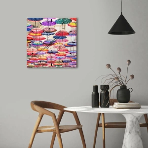 Guarda-chuvas em tons de rosa, azul e amarelo criam uma mistura harmoniosa de cores que anima qualquer ambiente. Cada detalhe do design foi cuidadosamente refinado para capturar a sensação de leveza e alegria trazida por esta paisagem urbana. Este relógio combina perfeitamente com interiores em um estilo moderno, artístico e eclético.