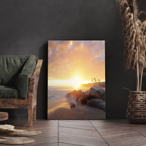 Brisa luminosa da noite é uma impressão em tela que retrata uma paisagem pitoresca do pôr do sol sobre uma costa rochosa. Os raios dourados do sol iluminam suavemente a cena, criando uma atmosfera única e trazendo harmonia.