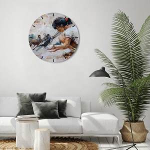 - Um relógio de parede com um motivo acolhedor e pictórico de uma menina alimentando pombos, acrescentando sutileza e expressão artística ao interior.