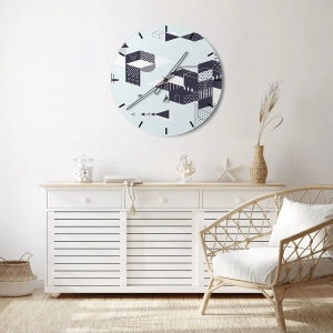 O relógio é feito de vidro de 4mm de espessura. A tecnologia de relógio está em conformidade com a classe de segurança 2B2 de acordo com a norma PN-EN 12600:2004, o que garante resistência ao impacto. O relógio em vidro está pronto para ser pendurado – possui um gancho de metal montado na parte de trás do relógio e um espaçador de espuma, que regula a distância uniforme entre o relógio e a parede. O relógio tem um mecanismo de fluxo silencioso alimentado por uma bateria de 1,5 V - bateria AA (a bateria não está incluída).