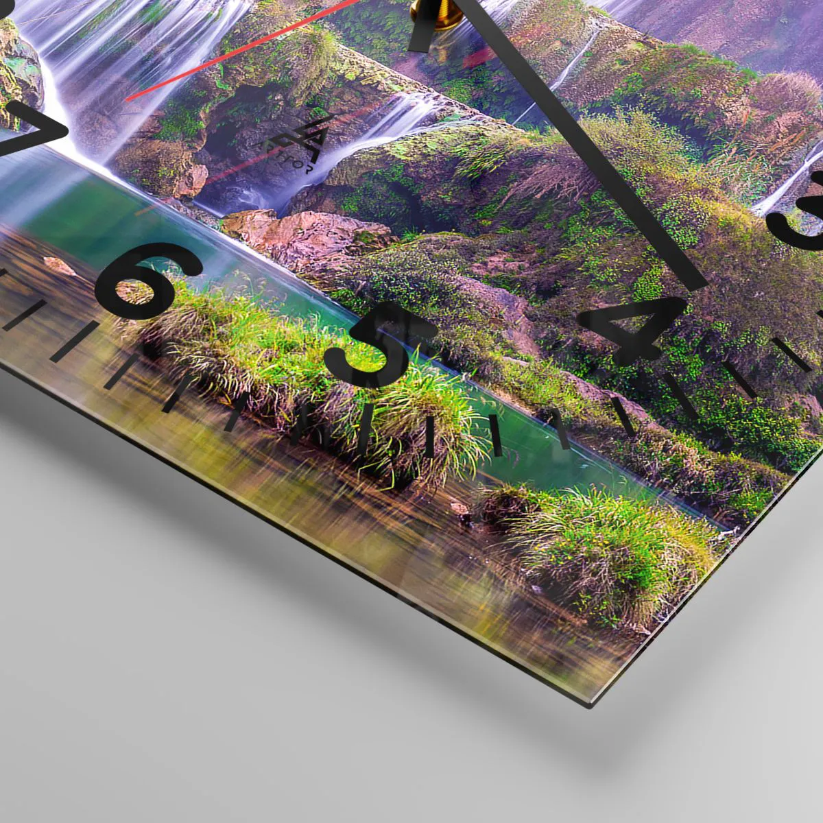 O relógio é feito de vidro de 4mm de espessura. A tecnologia de relógio está em conformidade com a classe de segurança 2B2 de acordo com a norma PN-EN 12600:2004, o que garante resistência ao impacto. O relógio em vidro está pronto para ser pendurado – possui um gancho de metal montado na parte de trás do relógio e um espaçador de espuma, que regula a distância uniforme entre o relógio e a parede. O relógio tem um mecanismo de fluxo silencioso alimentado por uma bateria de 1,5 V - bateria AA (a bateria não está incluída).