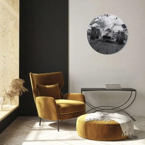 O design clássico da imagem em preto e branco é perfeito para interiores elegantes, modernos e masculinos. Detalhes, como a representação do movimento e da precisão do carro, enfatizam a atmosfera de dinamismo e velocidade, tornando o relógio um acessório ideal para entusiastas de corrida.