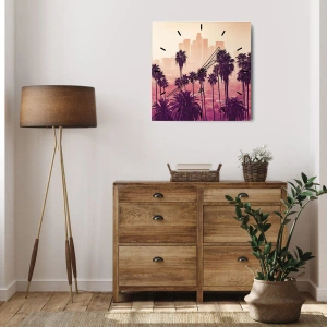 Paisagem da Califórnia é um relógio de parede que transmite a atmosfera de um pôr do sol em um cenário exótico. O motivo retrata palmeiras altas contra o pano de fundo de um horizonte da cidade, imerso em tons de rosa e bege, conferindo-lhe um caráter excepcionalmente acolhedor e romântico. Este design exclusivo se encaixa perfeitamente em interiores modernos, adicionando um toque de exotismo.
