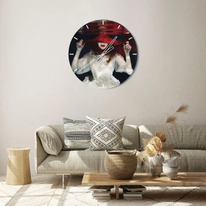 - Este relógio de parede redondo ARTTOR de 30x30 cm apresenta um motivo artístico exclusivo representando uma mulher com um chapéu vermelho, submersa em água, o que o torna um complemento perfeito para qualquer interior moderno.