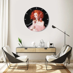 - Este relógio de parede redondo, medindo 30x30 cm de diâmetro, apresenta o retrato de uma mulher com cachos ruivos brilhantes segurando uma rosa. Seu design elegante em tons pastéis confere uma atmosfera sutil e romântica ao interior.