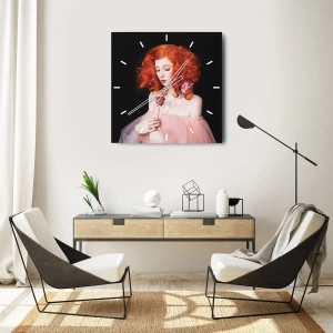Relógio de parede - Relógio em vidro - Retrato de uma mulher com cachos ruivos e uma rosa na mão - 30x30cm - Em estilo barroco - Decoração de parede moderna para a sala de estar, cozinha e quarto ARTTOR