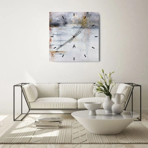 A pintura retrata uma composição abstrata dominada por Cinza, Branco e Dourado. As cores sutis criam a impressão de uma leve cortina de ar, repleta de requinte e elegância. O relógio se distingue por um estilo minimalista, porém sofisticado, que combina perfeitamente com um interior moderno.