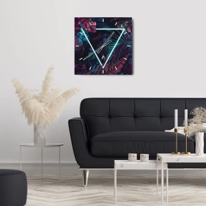 - Um relógio de parede redondo de vidro de 30x30 cm. Folhas tropicais e samambaias emolduradas por um triângulo neon sobre um fundo escuro. Uma composição moderna e marcante em estilos disco e futurista. Perfeito para interiores com personalidade.