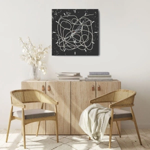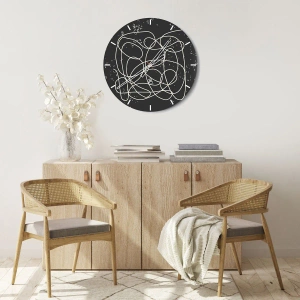 Relógio de Parede "Pensamentos Errantes" é uma abstração artística baseada em linhas expressivas e sinuosas sobre um fundo preto profundo. Os contornos brilhantes criam um padrão dinâmico que evoca um fluxo desordenado de pensamentos ou emoções.