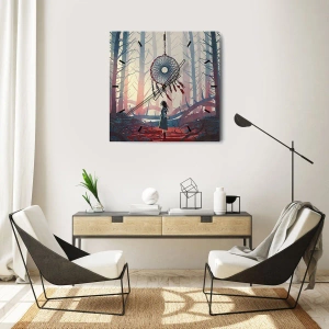 O relógio de parede "Ritual Secreto da Felicidade" é uma composição extraordinária que transporta o observador para o mundo dos sonhos, da espiritualidade e da magia oculta. Ele retrata uma figura em uma floresta misteriosa, observando um enorme Caçador de Sonhos suspenso entre as árvores.