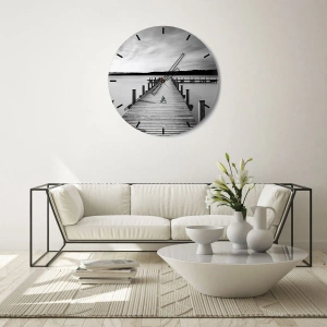 - relógio retrata um píer de madeira que leva a um lago tranquilo, em preto e branco. A paisagem minimalista infunde no interior uma atmosfera de silêncio, contemplação e paz atemporal.