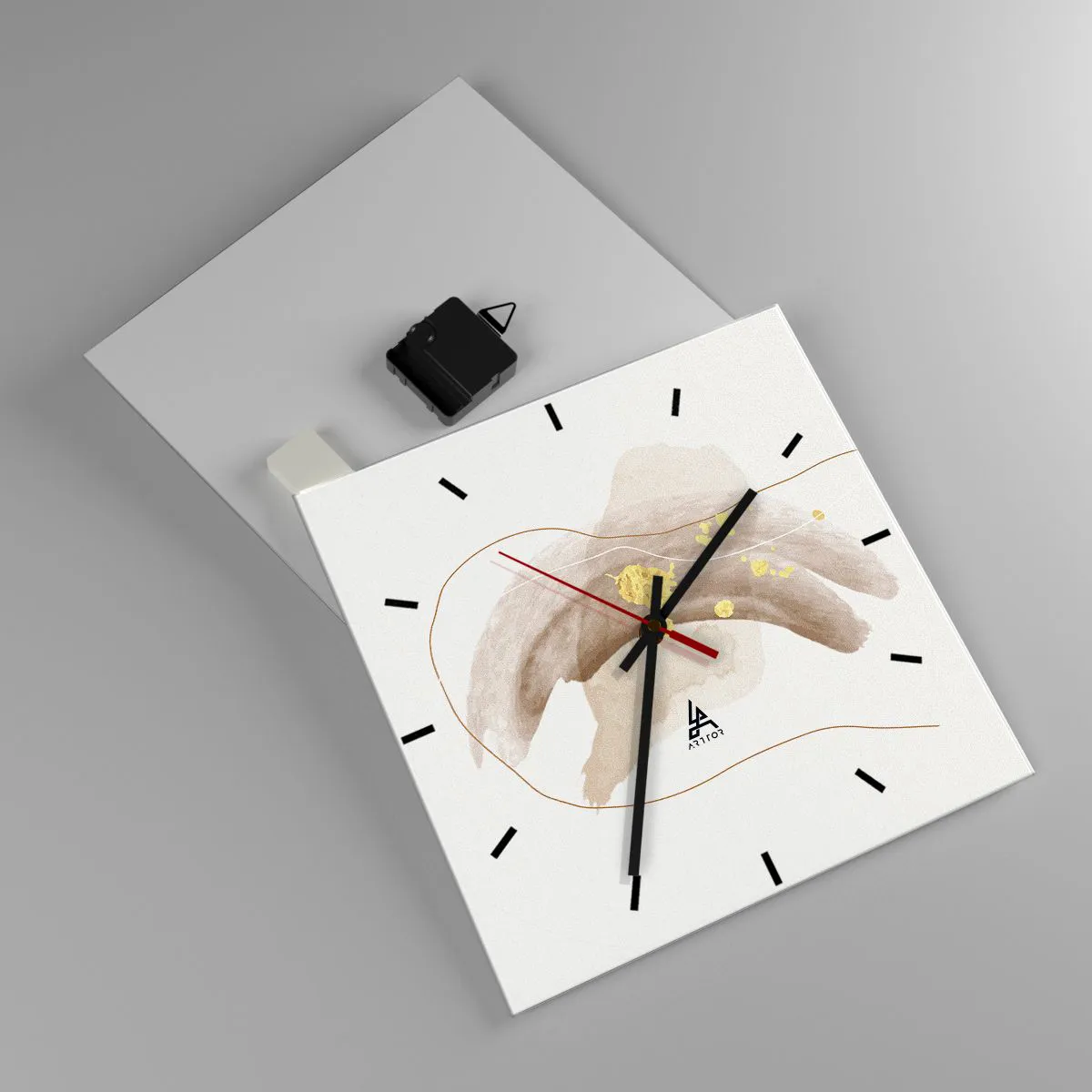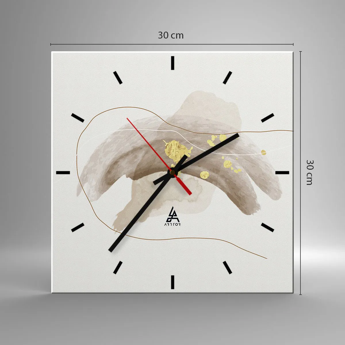 O relógio é feito de vidro de 4mm de espessura. A tecnologia de relógio está em conformidade com a classe de segurança 2B2 de acordo com a norma PN-EN 12600:2004, o que garante resistência ao impacto. O relógio em vidro está pronto para ser pendurado – possui um gancho de metal montado na parte de trás do relógio e um espaçador de espuma, que regula a distância uniforme entre o relógio e a parede. O relógio tem um mecanismo de fluxo silencioso alimentado por uma bateria de 1,5 V - bateria AA (a bateria não está incluída).